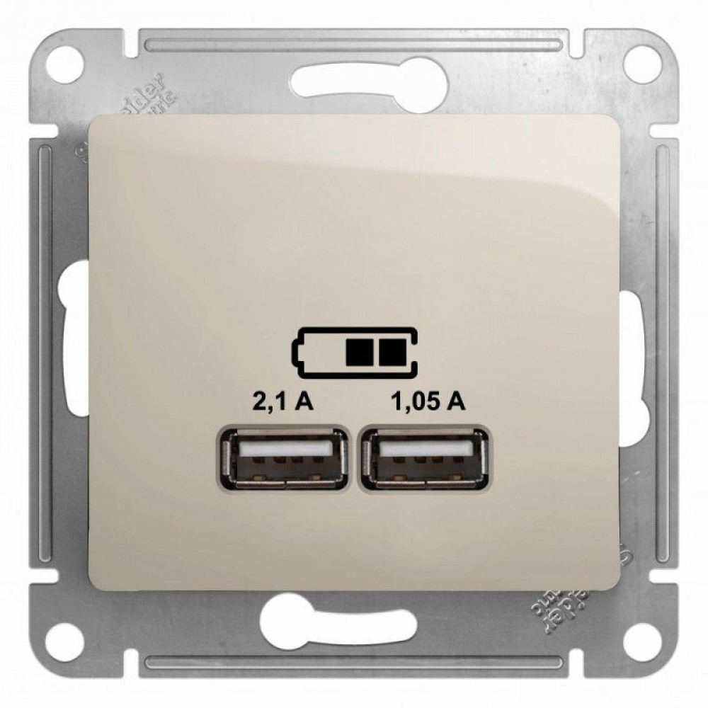 Механизм Systeme Electric (ранее Schneider Electric) серии Glossa (цвет молочный) розетки с двумя разъёмами USB с выходными напряжением 5 В постоянного тока и выходами с номинальным током по 2,1 А.