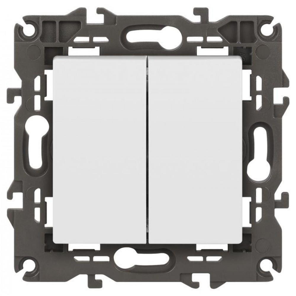 Выключатель 2-клавишный Эра Elegance белый 14-1104-01. Оснащён автоматическими клеммами для надёжной фиксации жил кабеля в механизме. Рамки приобретаются отдельно. Рамки Эра Elegance ПЛАСТИК: 1 пост 14-5001-хх, 2 поста 14-5002-хх, 3 поста 14-5003-хх, 4 поста 14-5004-хх, 5 постов 14-5005-хх; СТЕКЛО: 1 пост 14-5101-хх, 2 поста 14-5102-хх, 3 поста 14-5103-хх, 4 поста 14-5104-хх; МЕТАЛЛ: 1 пост 14-5201-хх, 2 поста 14-5202-хх, 3 поста 14-5203-хх, 4 поста 14-5204-хх; ДЕРЕВО: 1 пост 14-5301-хх, 2 поста 14-5302-хх, 3 поста 14-5303-хх, 4 поста 14-5304-хх (хх - код цвета: 00-прозрачный, 01-белый, белёный дуб, 02-слоновая кость, 03-алюминий, 04-шампань, 05-чёрный, чёрное дерево, 07-ясень, 09-дуб, 10-венге, 11-клён, 14-медь, 21-жёлтый, 22-оранжевый, 23-красный, 25-бордо, 26-лайм, 27-зелёный, 28-голубой, 29-синий, 30-розовый, 31-мокко, 32-серый, 41-сталь, 42-титан).