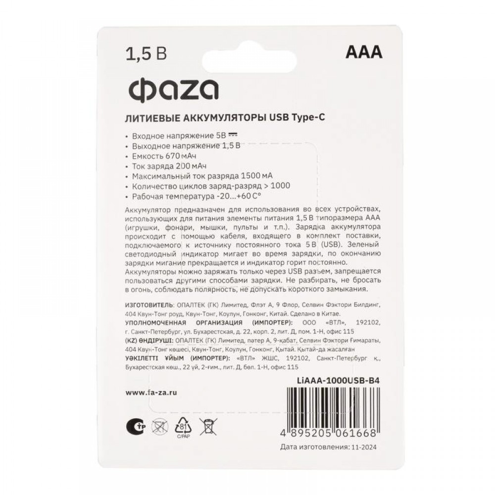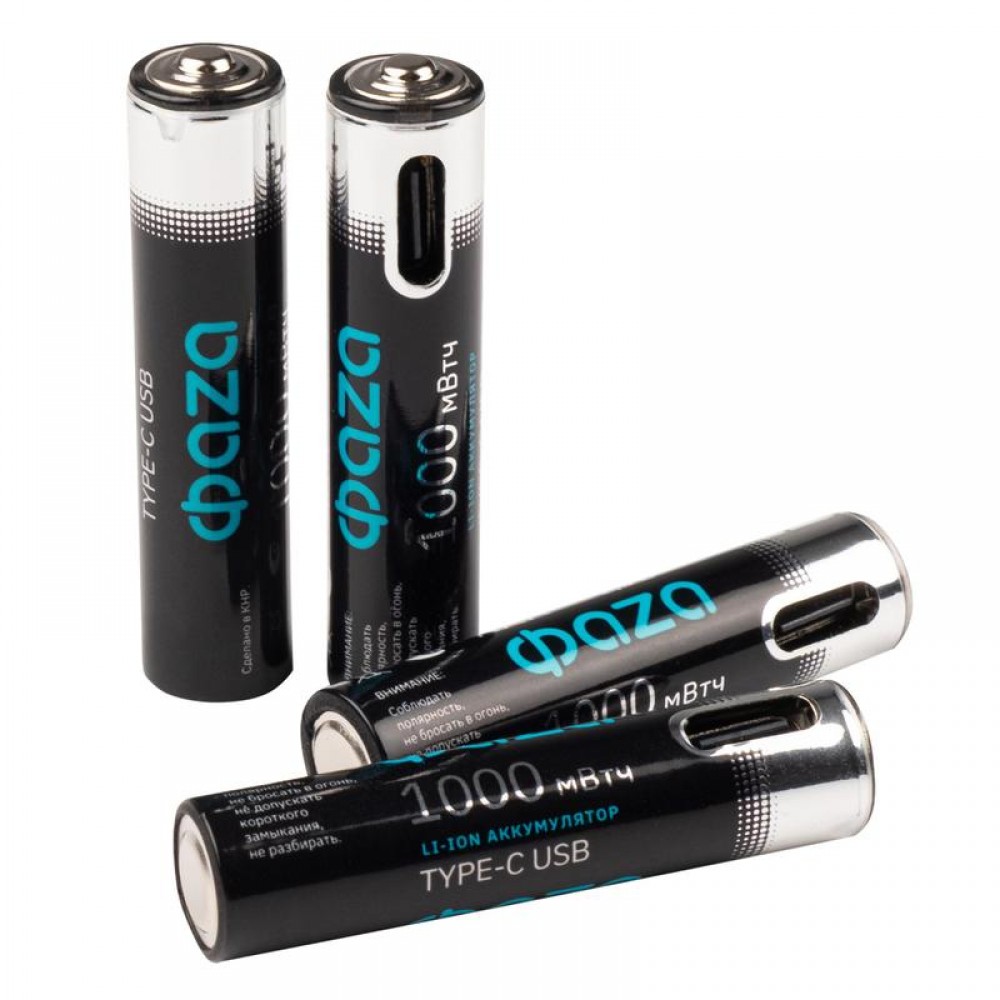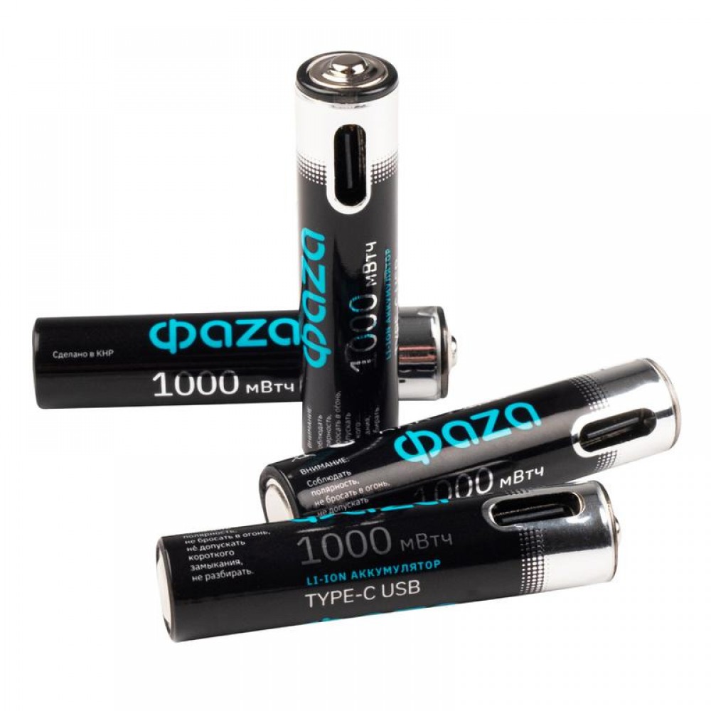Технические характеристики Аккумулятор литиевый AAA 1.5В Li-Ion 1000мВт.ч 660мА.ч зарядка от Type-C шнур в комплекте BL-4 (уп.4шт) ФАZА 5061668