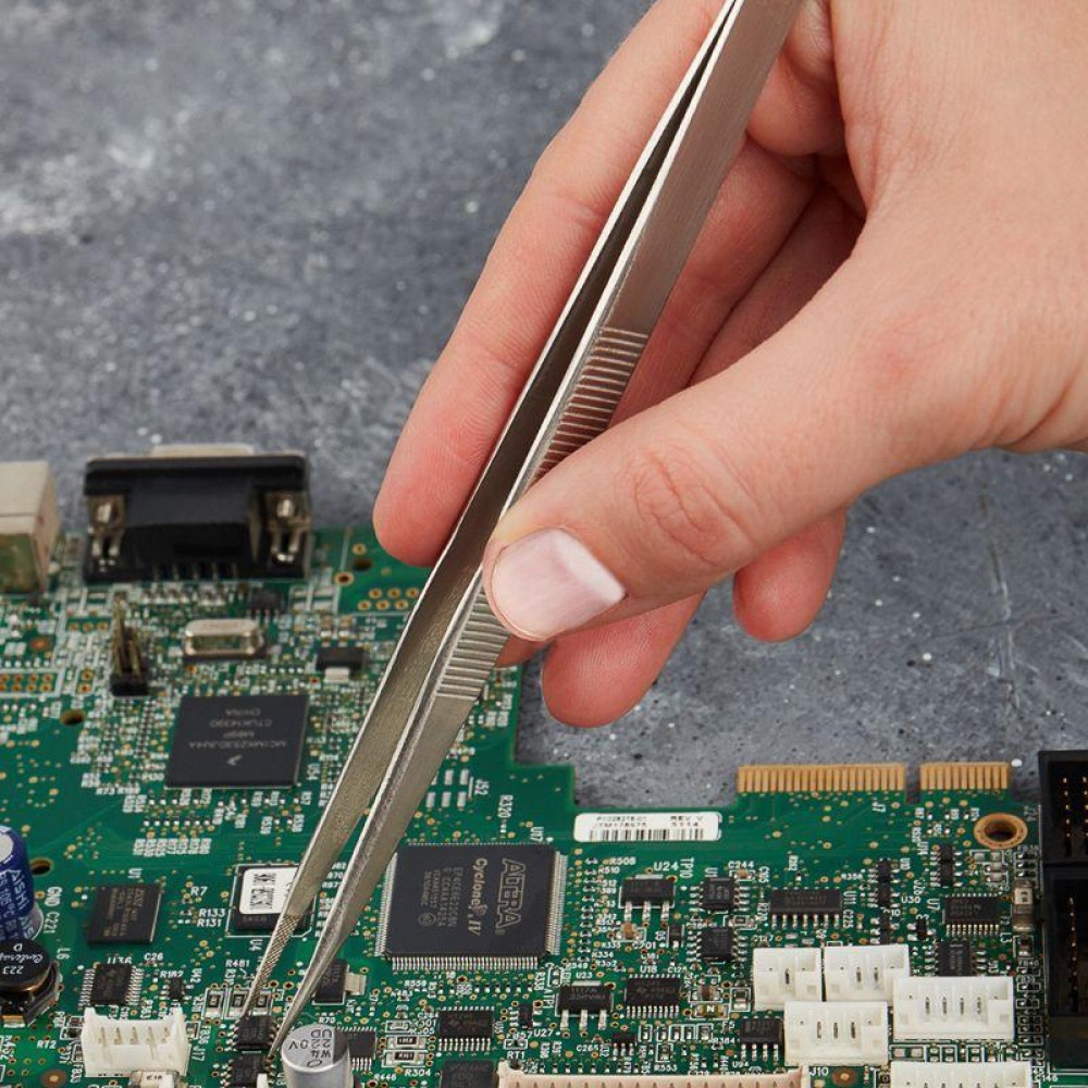 Прямые рифленые концы позволяют надежно удерживать детали. Оптимальная длина и небольшой вес пинцета делают работу наиболее комфортной.