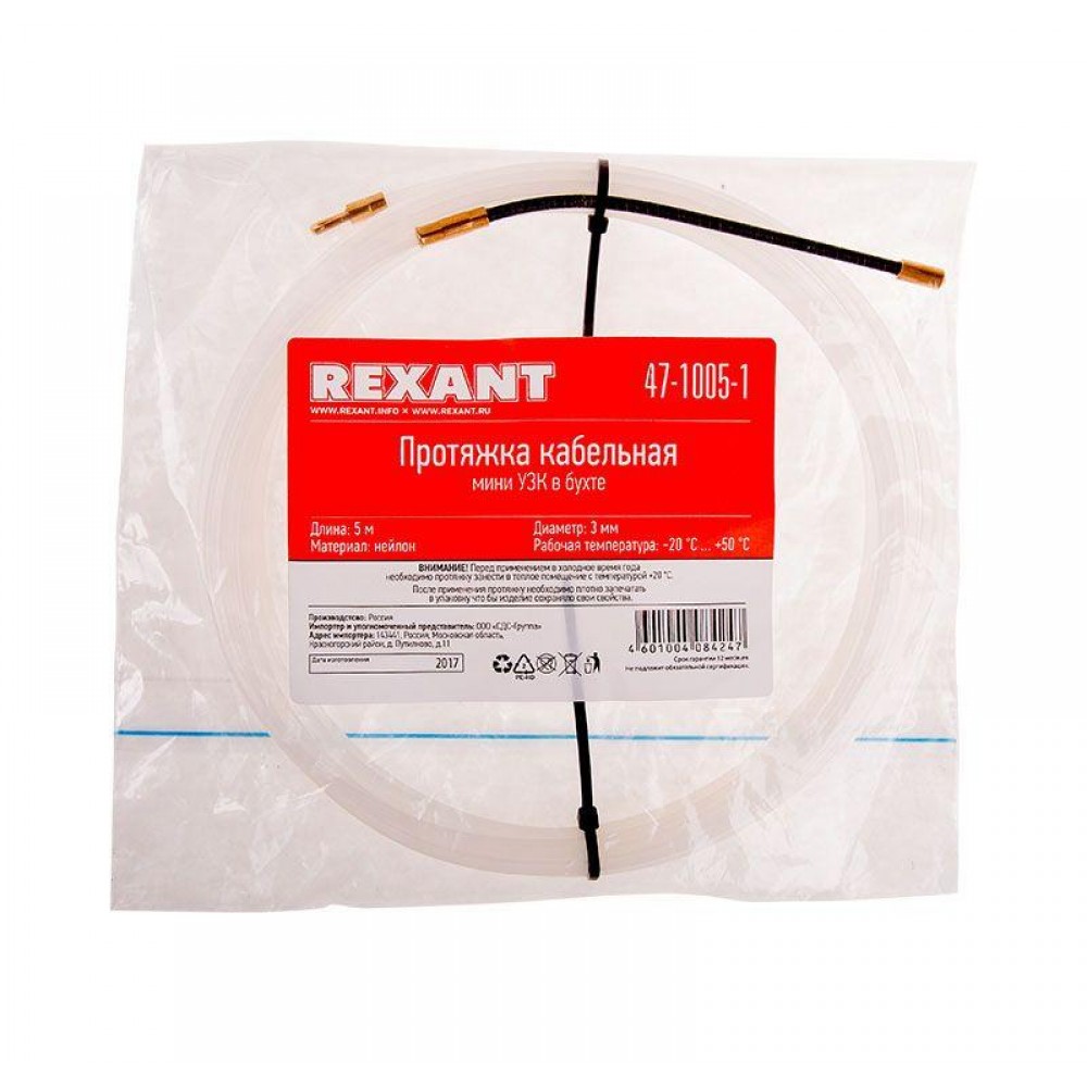 Технические характеристики Протяжка кабельная (мини УЗК в бухте) 5м нейлон d3мм латунный наконечник заглушка Rexant 47-1005-1