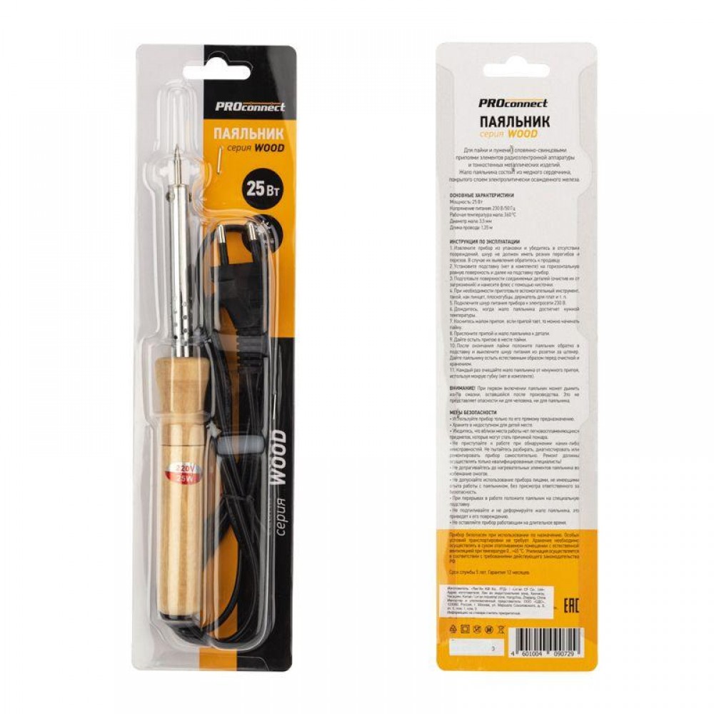 Технические характеристики Паяльник ПД 220В 25Вт деревянная ручка (блист.) PROCONNECT 12-0174-4