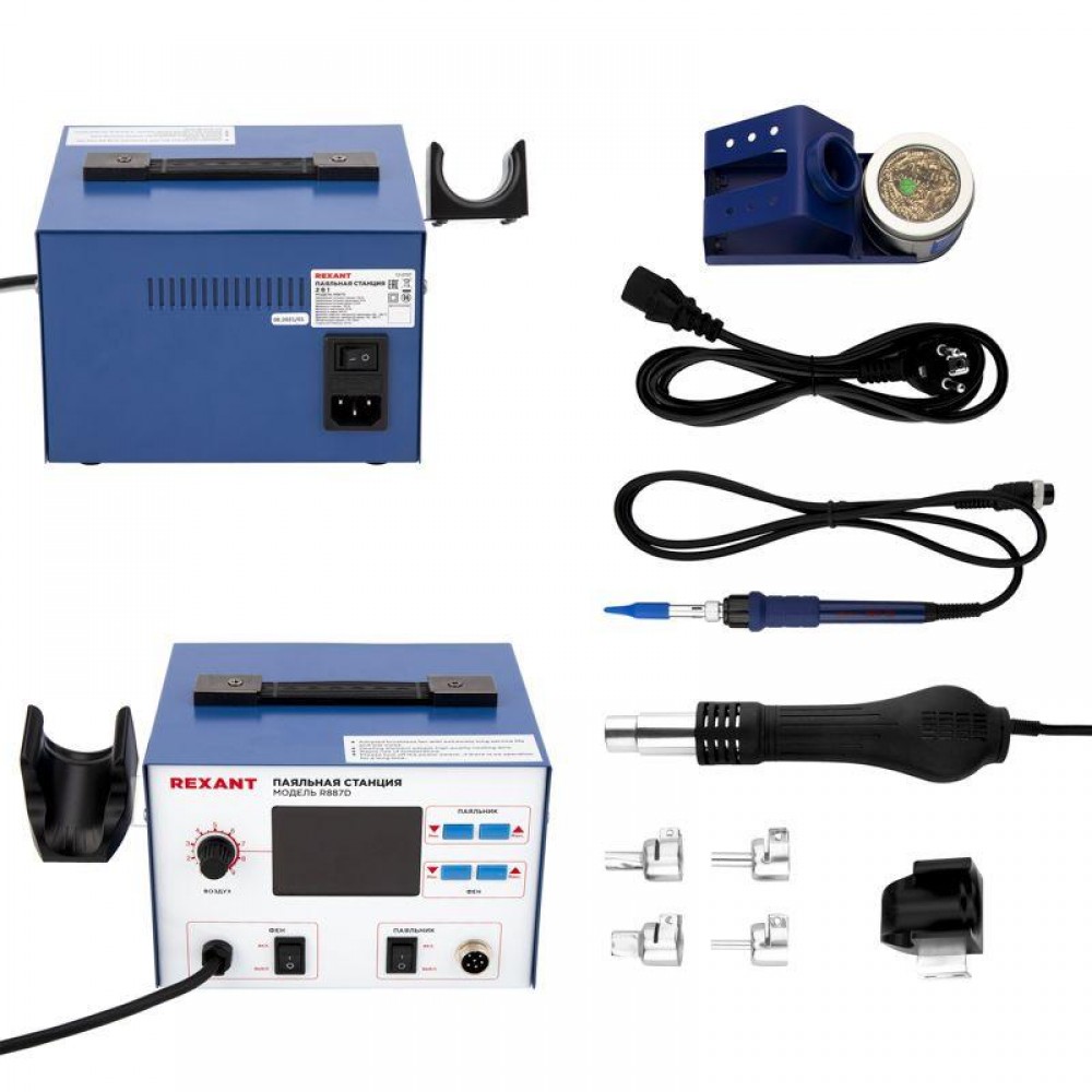 В комплектацию станции входят: основной блок, термофен, паяльник, держатель паяльника, держатель термофена, губка для очистки жала паяльника (в ложементе), 4 насадки для термофена 5, 8, 10 и 13 мм.