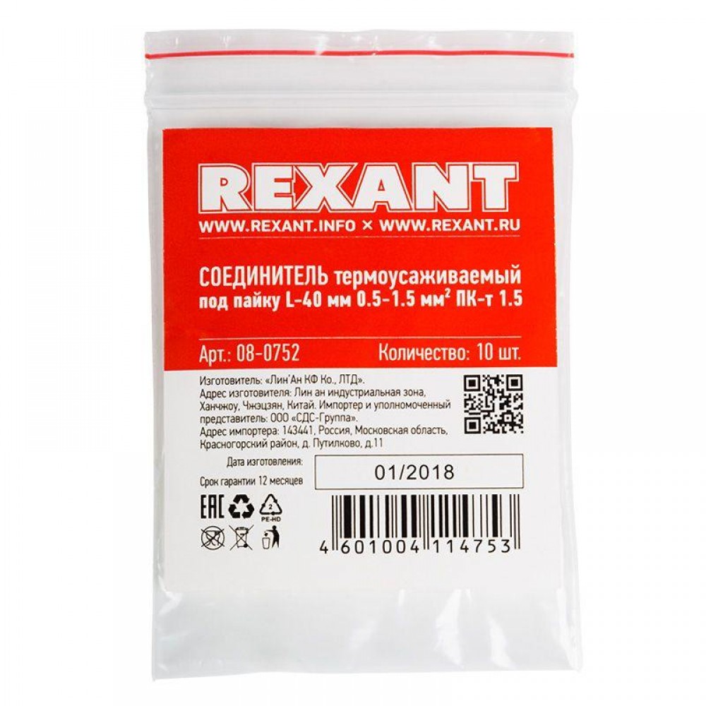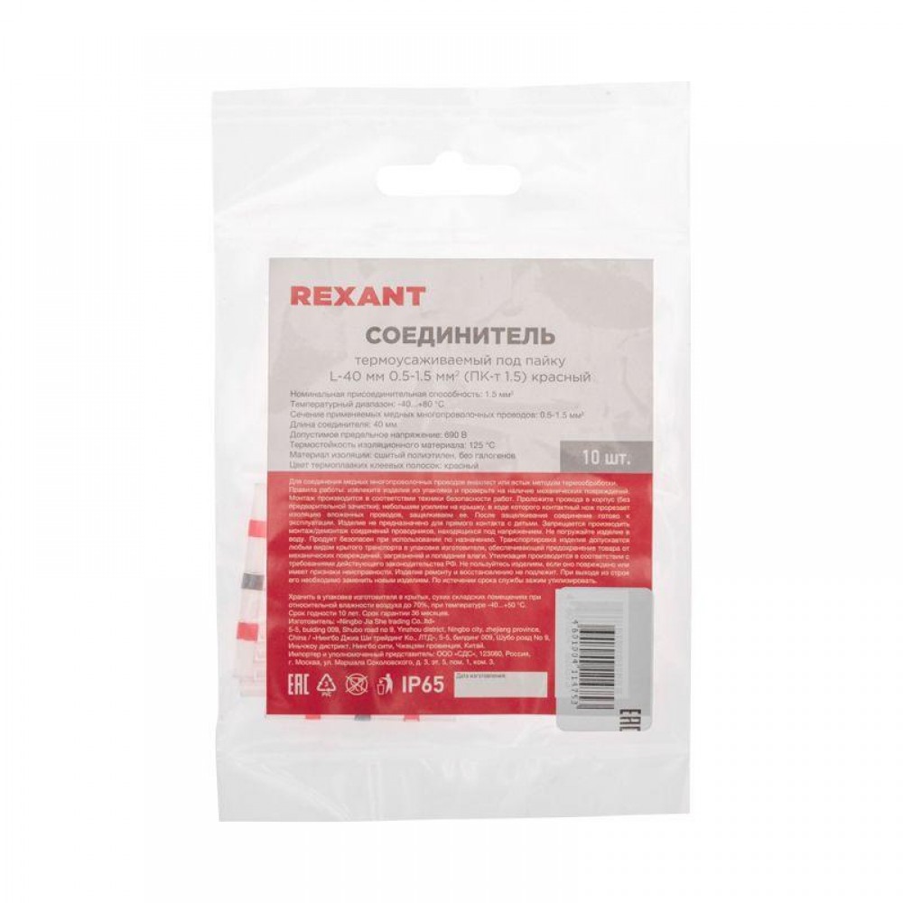 Технические характеристики Соединитель термоусаживаемый под пайку L-40 мм 0.5-1.5кв.мм (ПК-т 1.5) красн. Rexant 08-0752