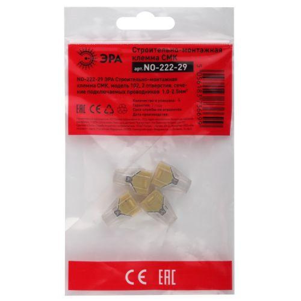 Технические характеристики Клемма строительно-монтажная СМК 102 NO-222-29 2-проводная 1.0-2.5кв.мм (уп.4шт) Эра Б0033402