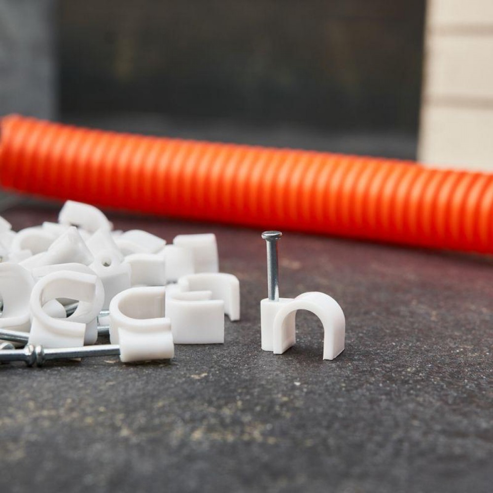 Круглый крепеж 9 мм с гвоздем предназначен для фиксации круглого кабеля к деревянной поверхности. Такой крепеж будет особенно полезен для использования на даче или в частном деревянном доме.