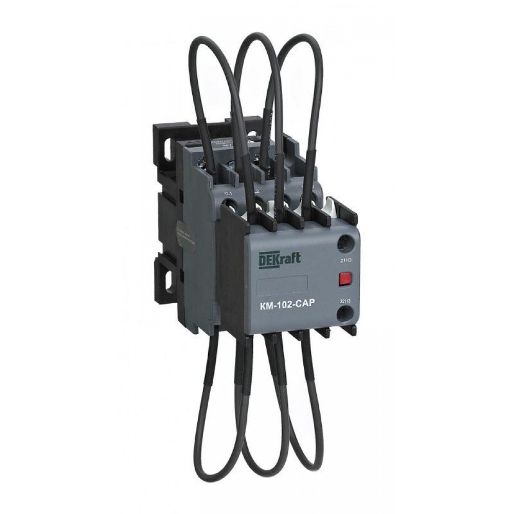Контактор конденсаторный серии КМ-102-CAP Dekraft предназначен для замыкания и размыкания электрических цепей батарей конденсаторов; 3P; номинальная мощность 12 кВАр; напряжение управления 220/230 В пер.тока; доп.контакты 2НЗ; установка на стандартную DIN-рейку. Контакторы КМ-102-CAP предназначены для использования в установках и щитах компенсации реактивной мощности (КРМ) централизовано на объектах или непосредственно у потребителей с низким коэффициентом мощности.