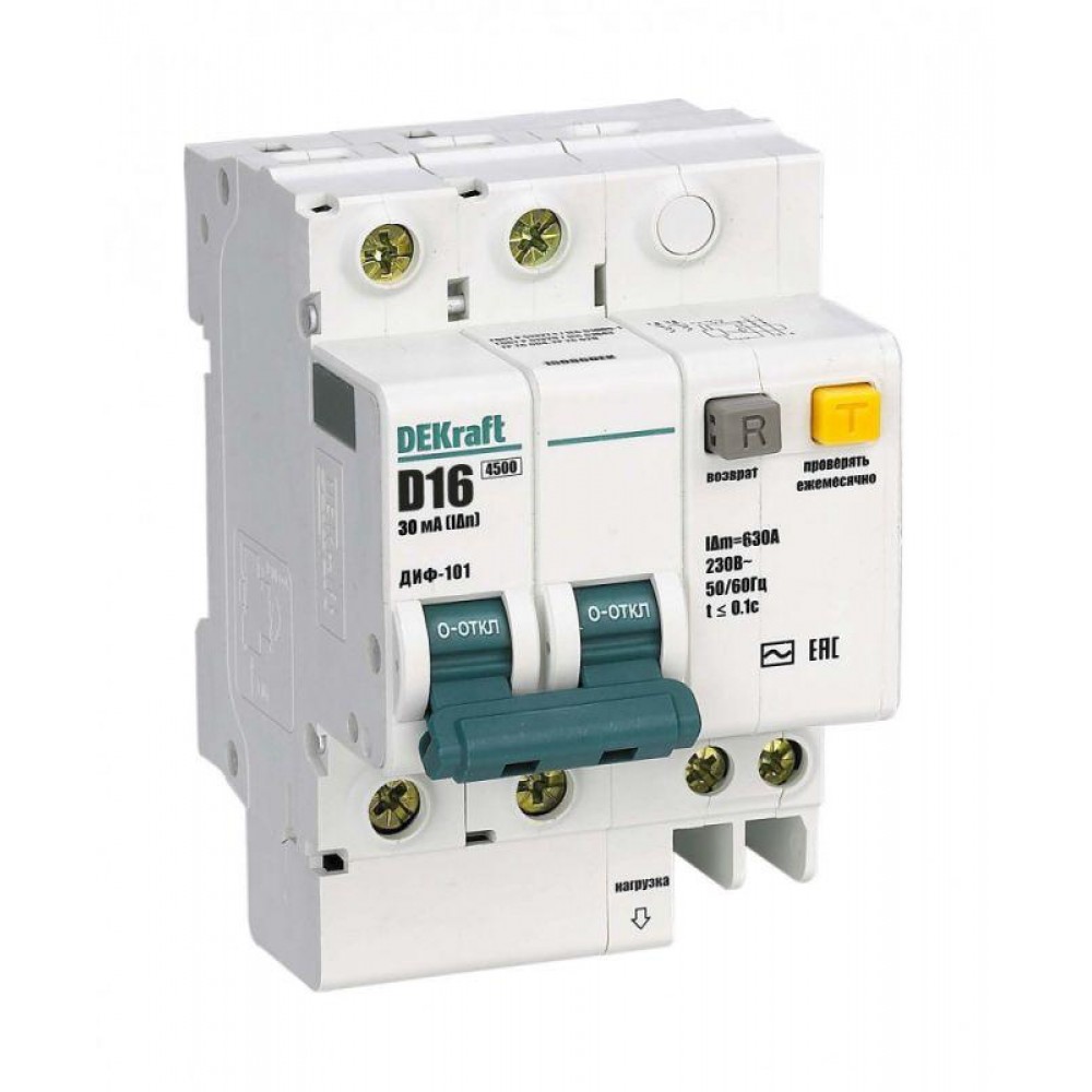 Выключатель автоматический дифференциального тока 2п D 16А 30мА тип AC ДИФ-101 со встроен. защитой от сверхтоков DEKraft 15086DEK