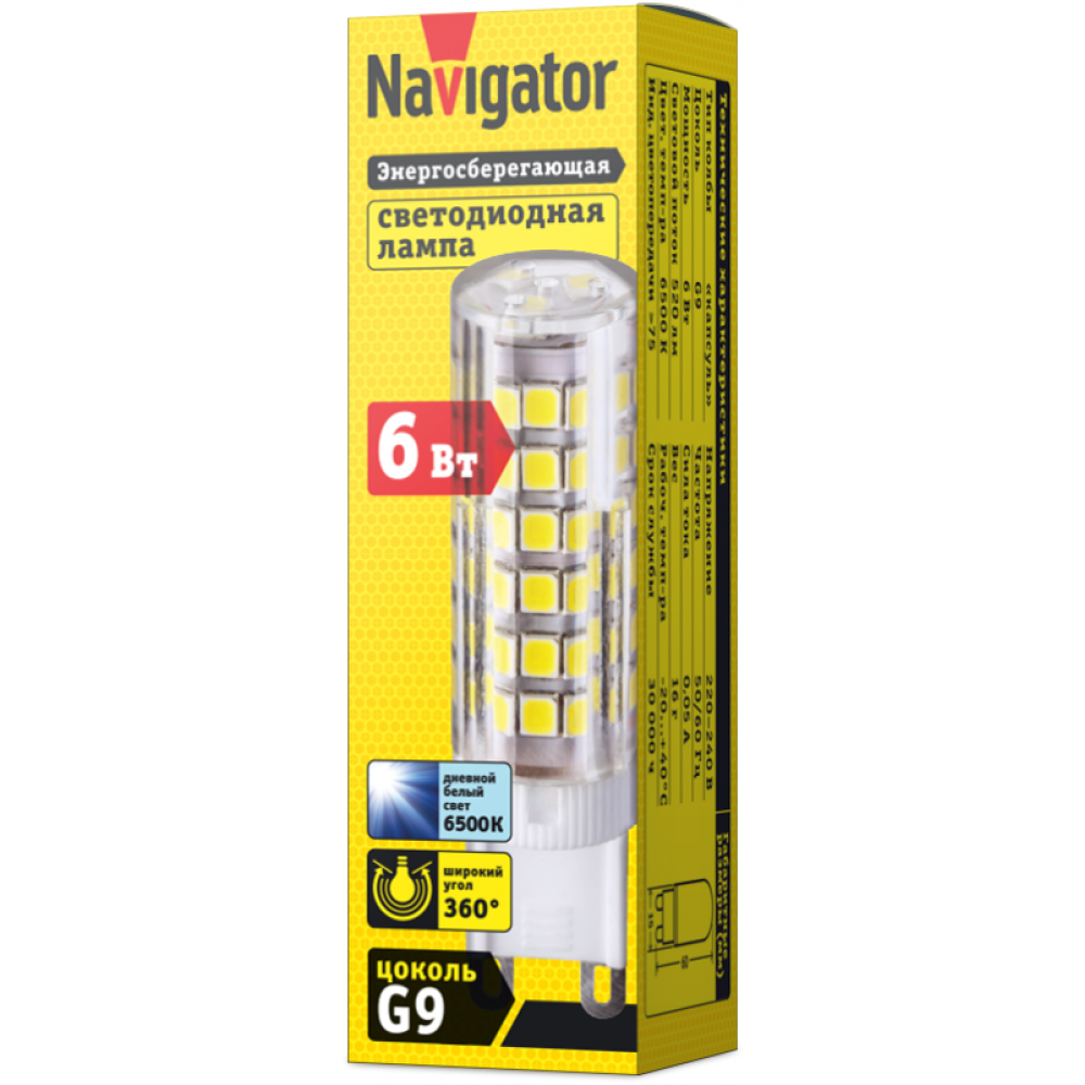 Технические характеристики Лампа светодиодная 14 012 NLL-P-G9-6-230-6.5K 6Вт прозрачная 6500К холод. бел. G9 520лм 220-240В Navigator 14012