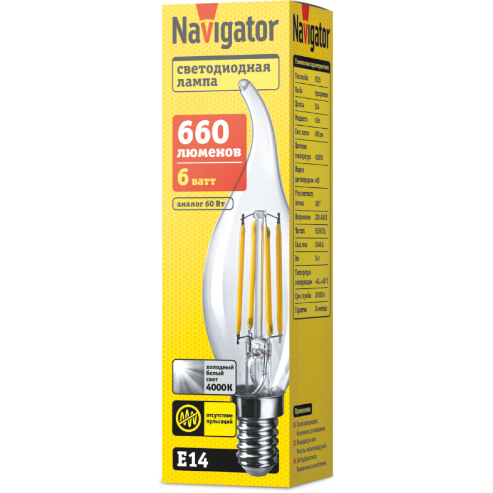 Технические характеристики Лампа светодиодная 61 357 NLL-F-FC35-6-230-4K-E14 6Вт свеча на ветру 4000К нейтр. бел. E14 660лм 220-240В Navigator 61357