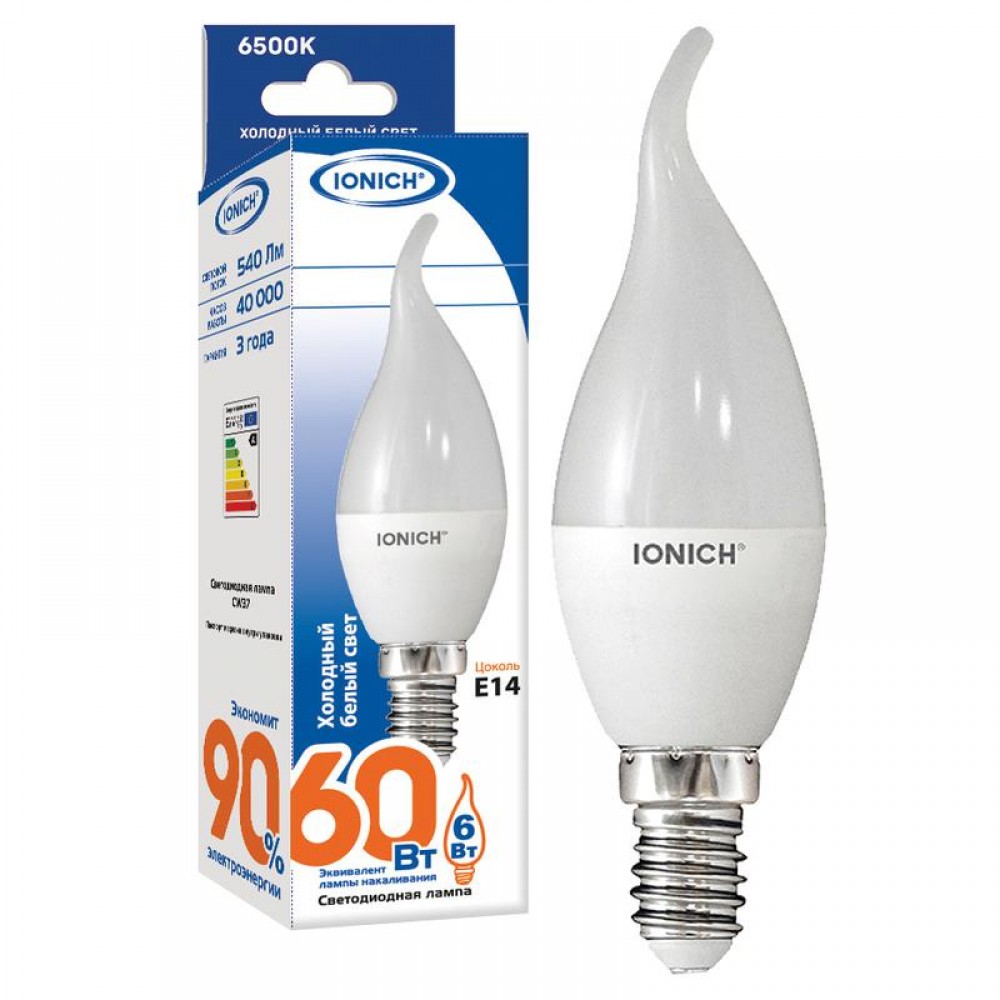 Технические характеристики Лампа светодиодная ILED-SMD2835-CW37-6-540-220-6.5-E14 (1120) 6Вт свеча на ветру 6500К холод. бел. E14 540лм 230-240В IONICH 1608