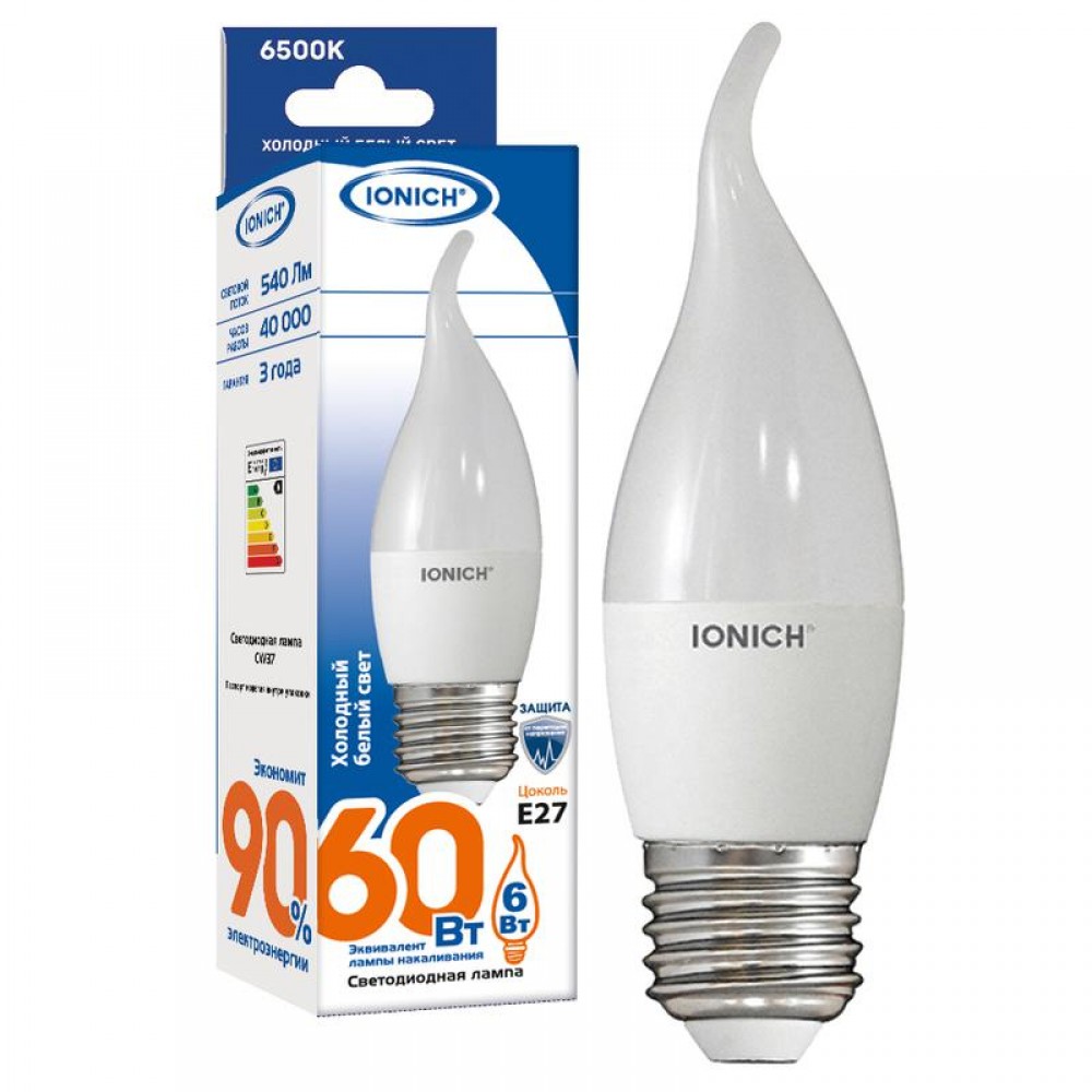 Технические характеристики Лампа светодиодная ILED-SMD2835-CW37-6-540-220-6.5-E27 6Вт свеча на ветру 6500К холод. бел. E27 540лм 230-240В IONICH 1541