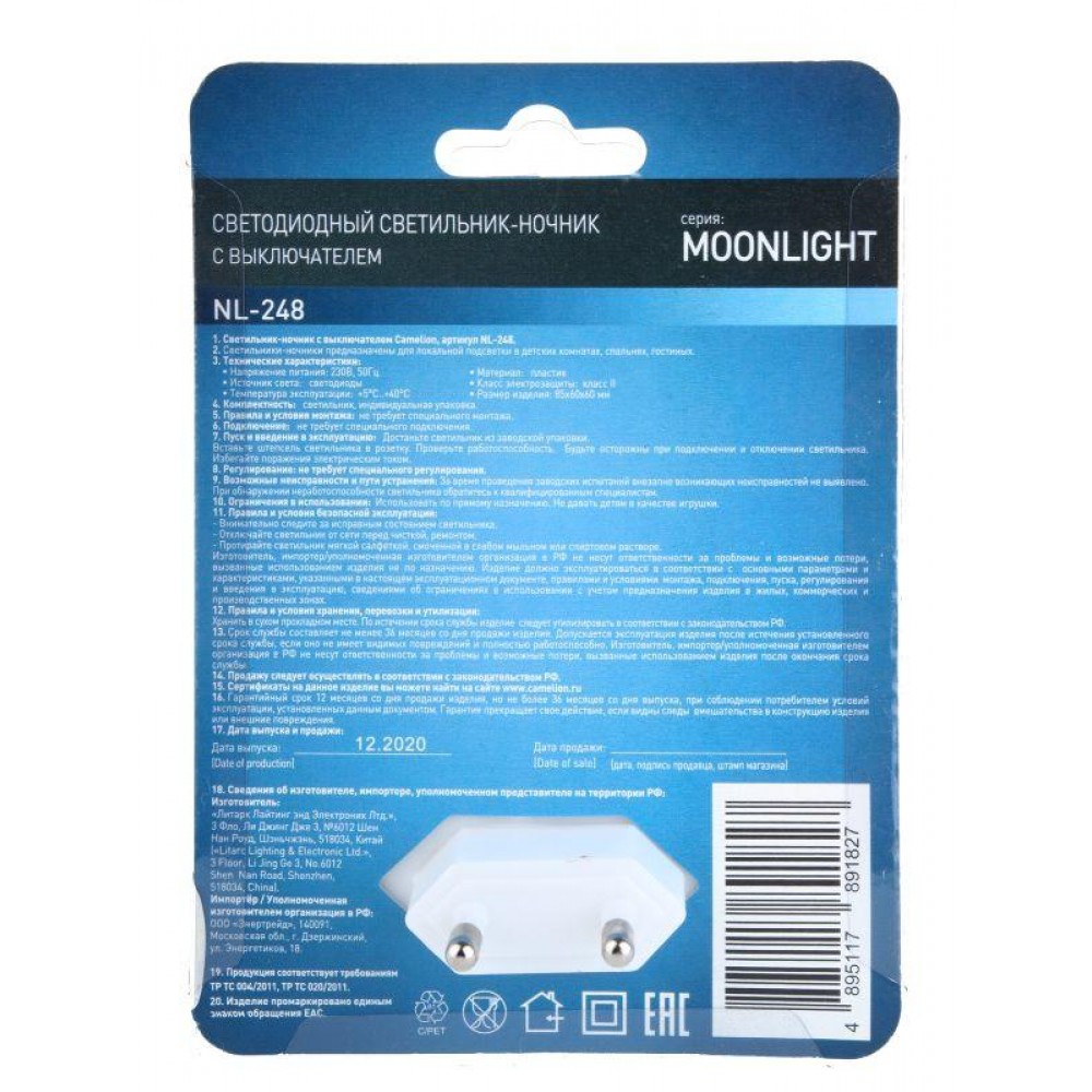 Camelion NL-248 "Месяц2", питание от сети 220В, размеры 85*60*60мм, источник света - встроенные светодиоды, выключатель на корпусе, пластик