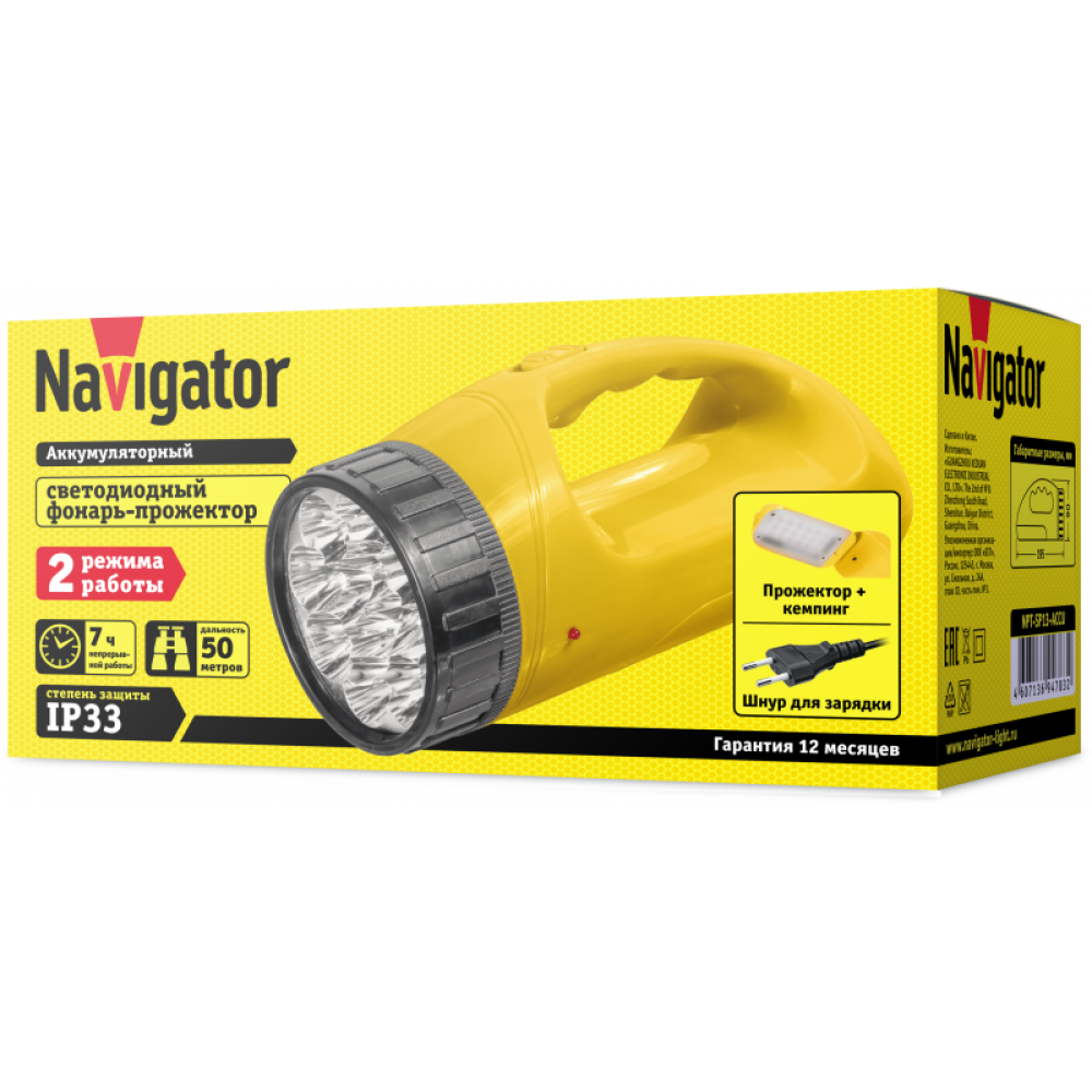 Технические характеристики Фонарь-прожектор аккумуляторный кемпинговый 94 783 NPT-SP13-ACCU 12 + 18LED 90лм аккум. 1.1А.ч NAVIGATOR 94783