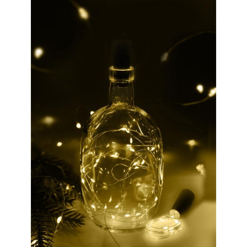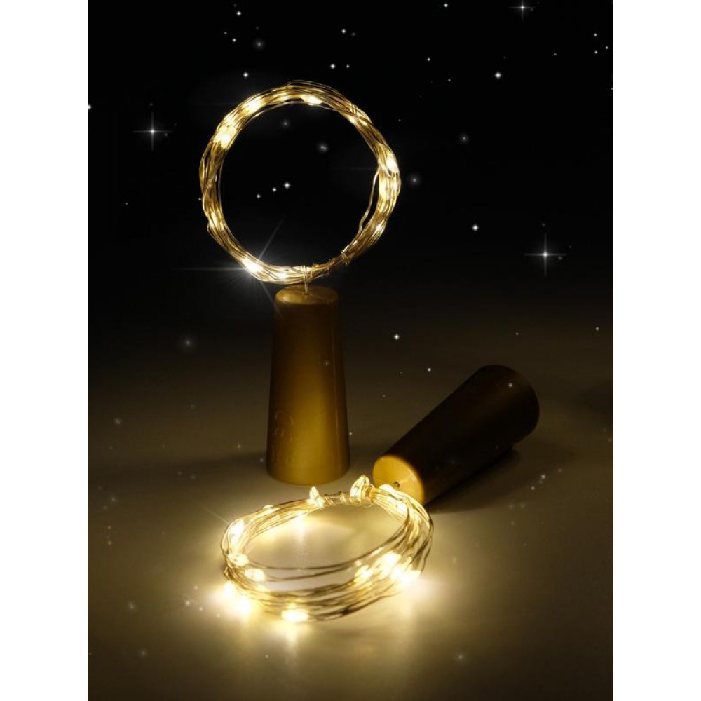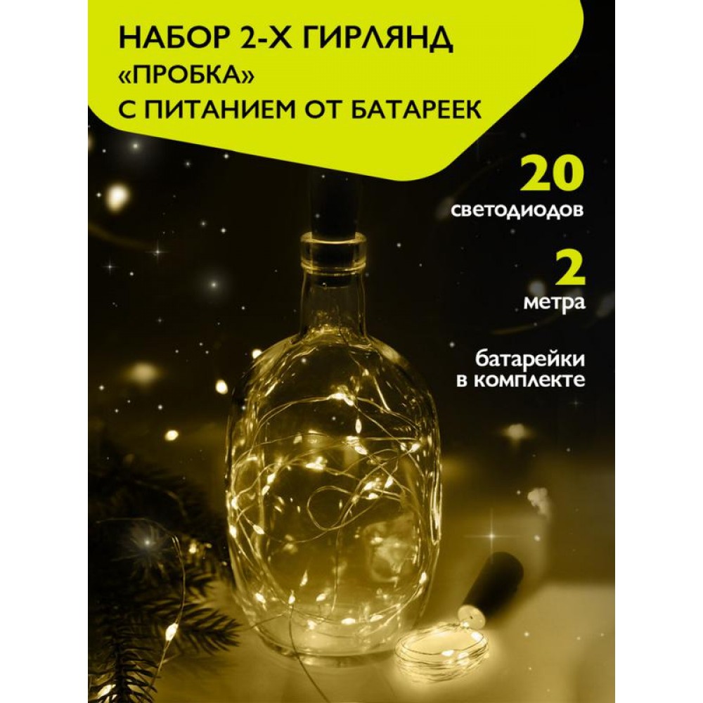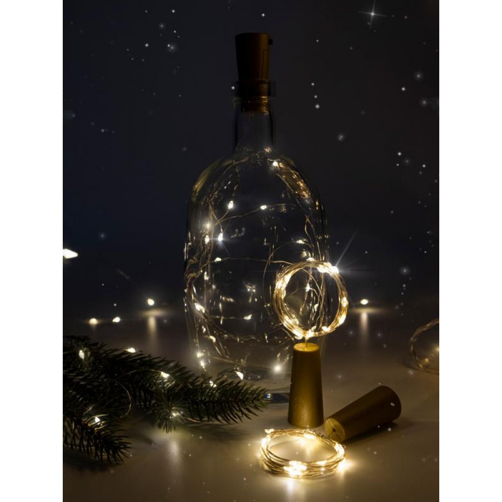 - Гирлянда-роса с питанием от батареек. Элементы питания входят в комплект. В каждом комплекте – 2 гирлянды. - Блок питания выполнен в виде пробки для бутылки, что позволяет создать оригинальное украшение интерьера или праздничного стола. - Гирлянда подходит для использования внутри помещения (степень пылевлагозащиты IP20). Кнопка включения и выключения находится на блоке питания. - Материал корпуса блока питания – PVC-пластик, в гирлянде используется медный провод.