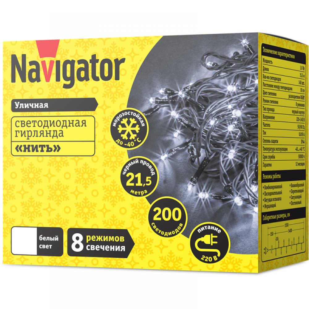 • Гирлянда светодиодная 61 832 NGF-S01-200CW-10-21.5m-230-C8-BL-IP44 Navigator 61832