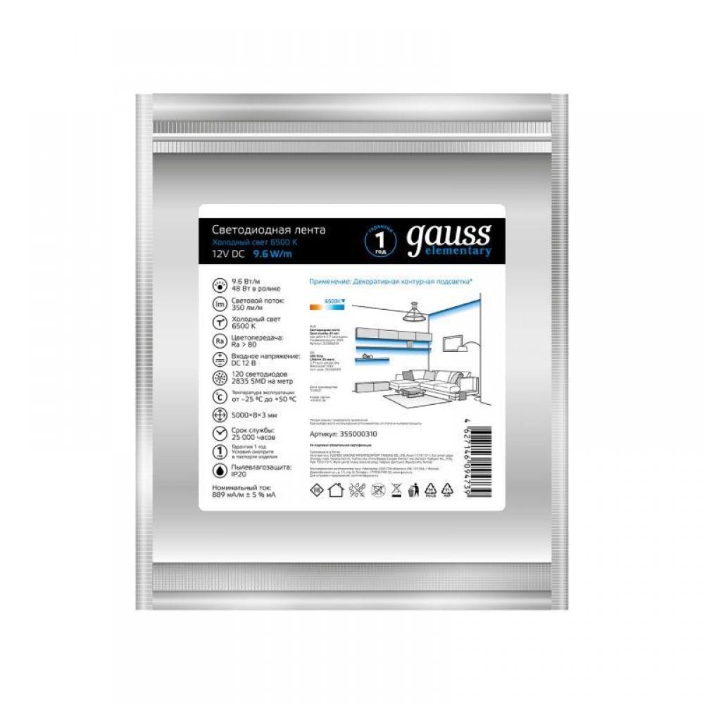 Лента светодиодная Elementary 2835/120-SMD 9.6Вт/м 6500К холод. бел. IP20 340лм/м 12В 8мм (уп.5м) GAUSS 355000310