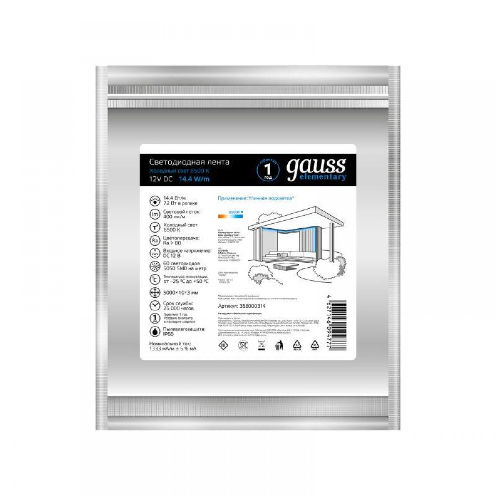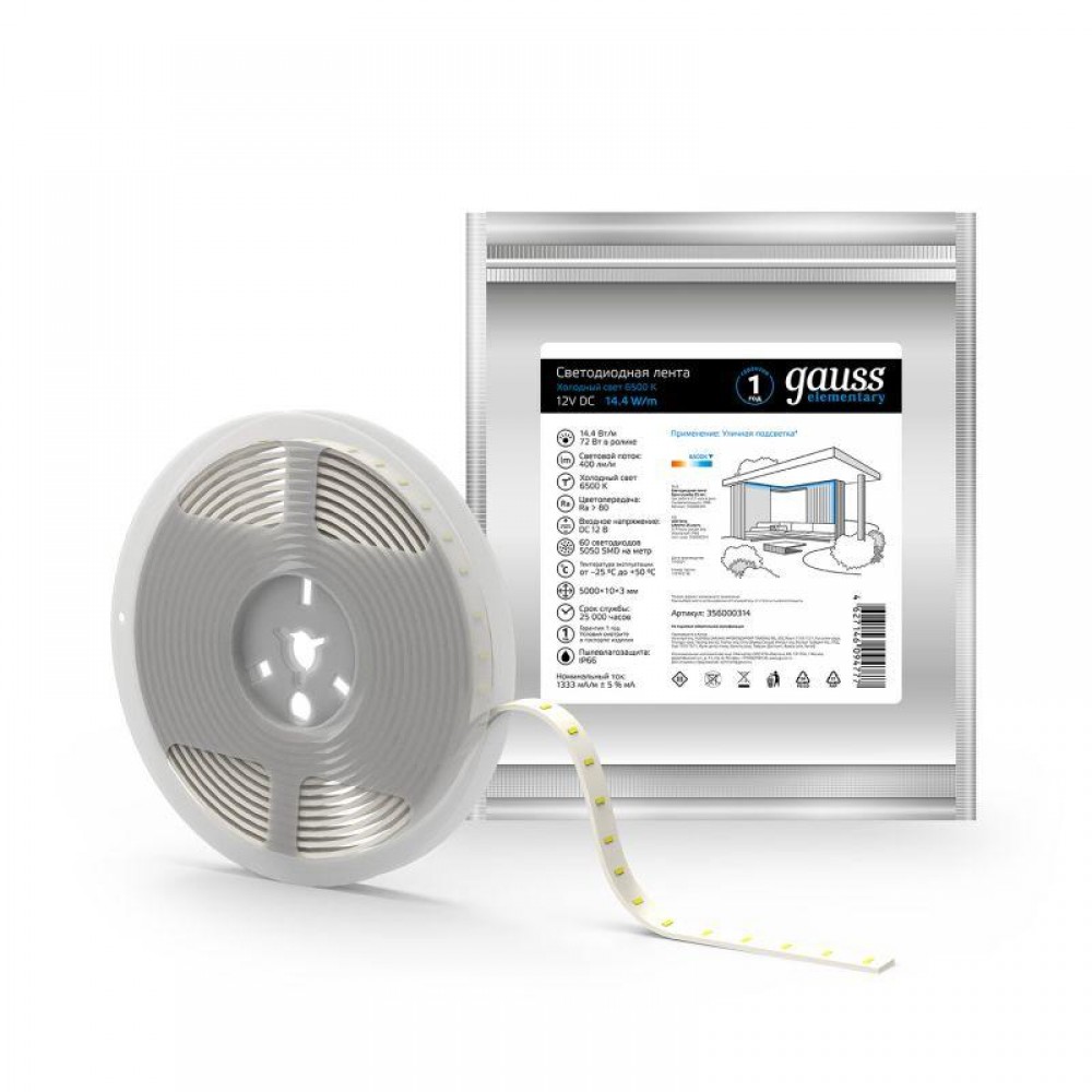 Технические характеристики Лента светодиодная Elementary 5050/60-SMD 14.4Вт/м 6500К холод. бел. IP66 430лм/м 12В 10мм (уп.5м) GAUSS 356000314