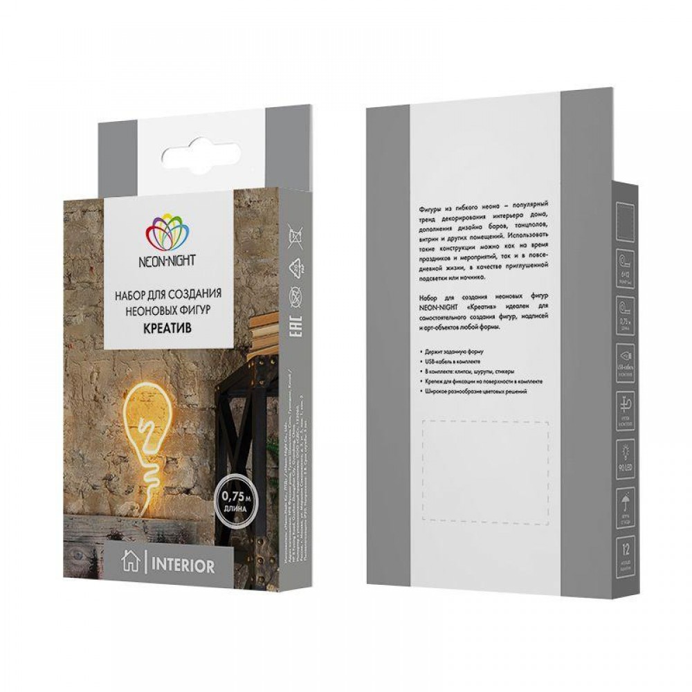 Набор для создания неоновых фигур «Креатив» станет отличным подарком к любому празднику и порадует как взрослых, так и детей, возможностью создать уникальные световые фигуры, которые гармонично украсят интерьер. Длина трубки с 90 диодами — 75 см. Светодиоды излучают ровный синий свет и получают питание от стандартной сети через понижающий трансформатор на 5 В. В комплекте идет USB-шнур, монтажные клипсы, наклейки, крепеж. Гибкий неон предназначен для размещения в сухих теплых помещениях.