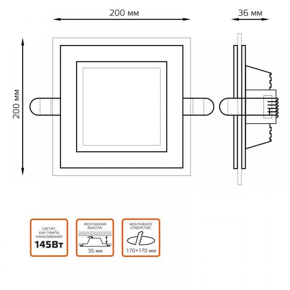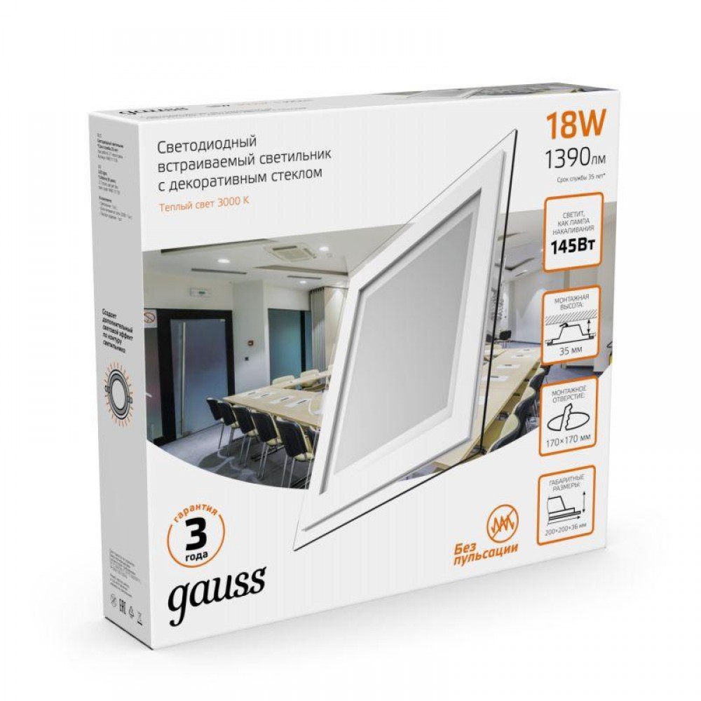 Технические характеристики Светильник светодиодный Glass 18Вт 3000К IP20 1390лм 220-240В ДВО квадрат с декоративн. стеклом бел. GAUSS 948111118