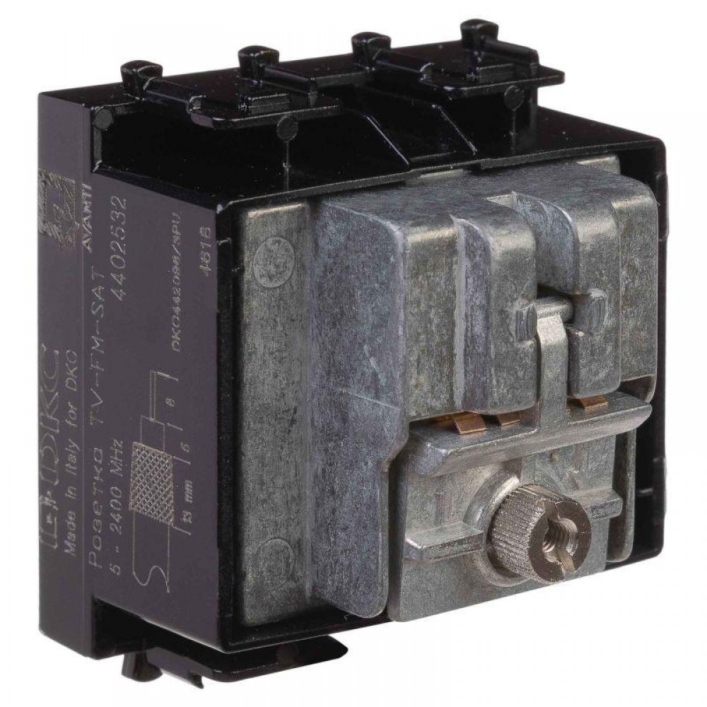 Розетка TV-FM-SAT модульная. Назначение: для монтажа в систему кабельных коробов "In-liner Front" и систему алюминиевых кабельных коробов и колонн "Aero", лючки и башенки BUS, при помощи рамок-суппортов и каркасов "Avanti" (код 4400912 и т.д.); подключение теле- и радиокабеля. Характеристики: винтовые зажимы; диапазон рабочих частот 4–2400 МГц; затухание
