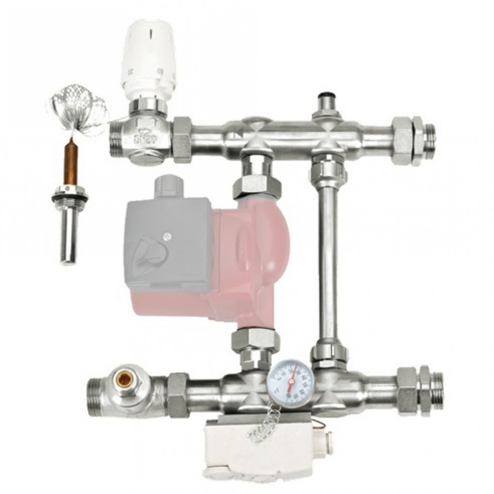 Насосно-смесительный узел Е011-1 предназначен для создания в системе отопления здания открытого циркуляционного контура с пониженной температурой теплоносителя. Монтируется на коллекторной группе низкотемпературного контура. Подключается к высокотемпературному контуру системы отопления.